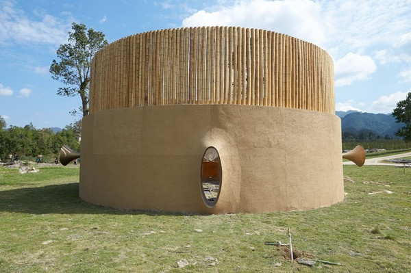 这个半封闭式的圆形结构,取酉阳当地的泥土为材筑成墙面。从外部进入踩在《流年》内的鹅卵石上,四周地面会晃动,能从建筑物身上的两个喇叭,听到来自自然地“世外”之声。