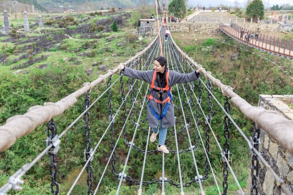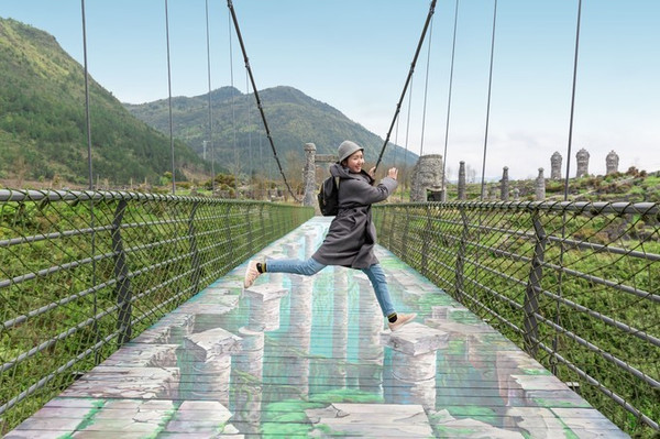 桥两旁全是像蘑菇一样的叠石,景观索桥走起来非常稳,老人小孩都能走。