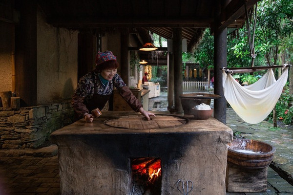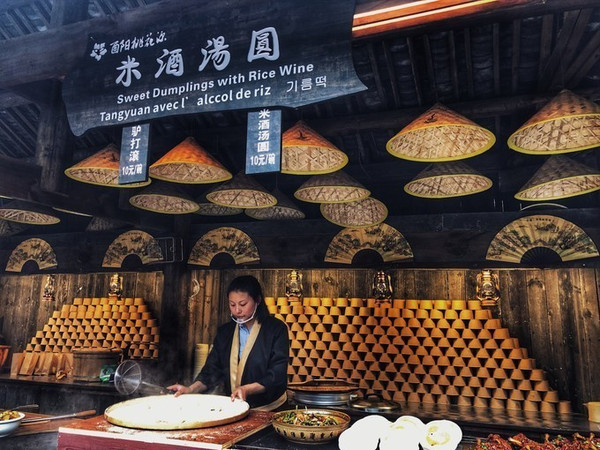 嗅闻炊烟的桃源酒家内谷物丰存,还能见到栽桑养蚕、编织麻布、撵磨牛耕等场景,以及各种桃源小吃,满足我的重庆胃。