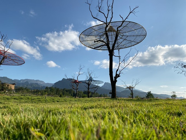 一群带着斗笠的大树:斗笠本是一种乡村遮阳避雨的工具。每棵树上都戴有一顶属于它们的斗笠,戴上了斗笠就是戴上了家乡,树木植根于家乡的故土,故乡因为这顶斗笠,在艺术家心中永存。