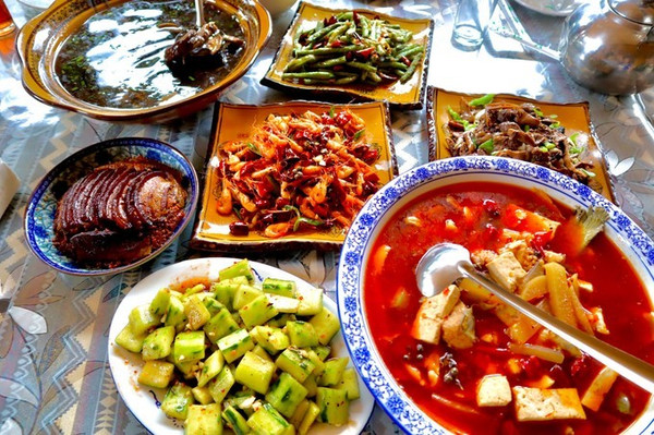 由于酉阳在四川武汉湖南交界,所以这里口味其实融会贯通三地特色。冬天一家人在伙食房围着火坑里的柴火或疙篼火取暖,上面安放三角用鼎罐煮饭。也有人家将鼎罐悬挂于灶头出火上方,底部接近火苗煮饭。用大米、玉米或红苕、洋芋混合烧煮的饭格外香味扑鼻。煮鼎罐饭所需的水一次性掺入,米在水开后掺入搅拌,一般不粒汤,汤快烧完时盖上鼎罐盖,用小火慢慢炖煮。