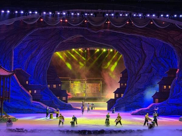 光这个舞台就修了三年,场舞台区设有扇形水幕、喷火特效、360度威亚。
