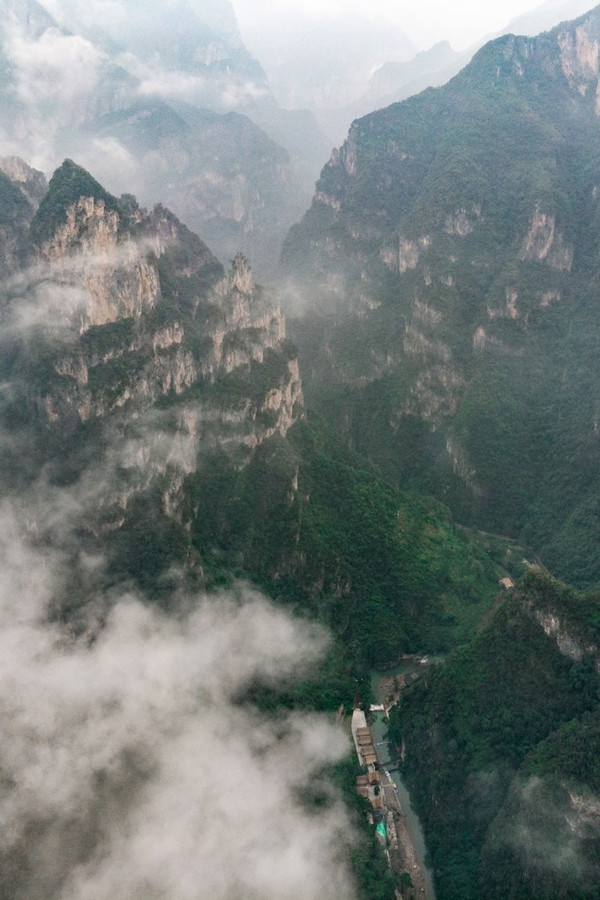 穿过神女天路来到了神女景点的山顶,然后乘坐索道从山的高峰向下滑去,这一条索道的垂直地面高度超过1公里,然后步行一段路来到神女天梯,最后再通过索道来到最下面的神女溪。