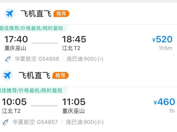 重庆—巫山,起飞10:00左右 落地11:00 左右