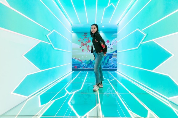 乘坐透明观光电梯到达四楼进入剧场前,整个室内布局也让人眼前一亮,很清爽也很国潮,是向着年轻人靠拢的方式在打造。