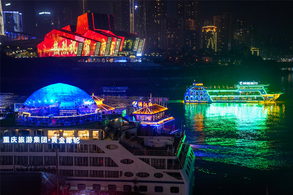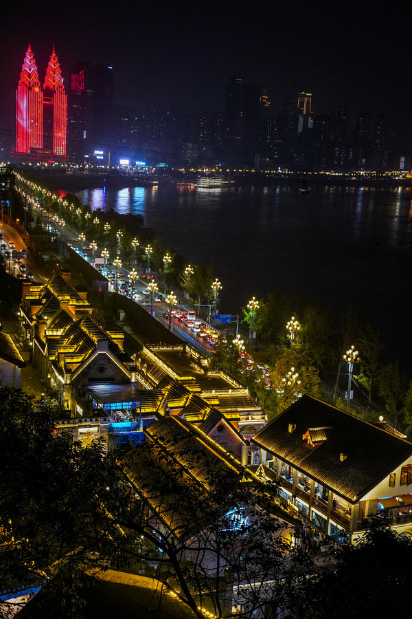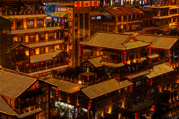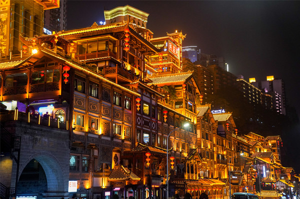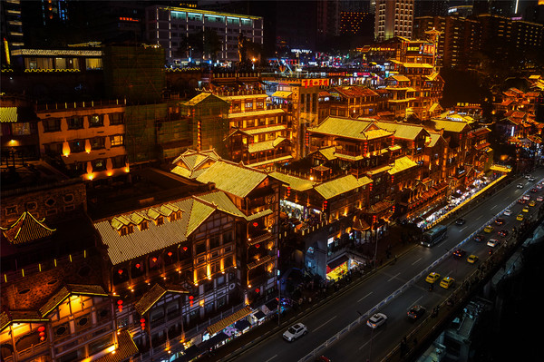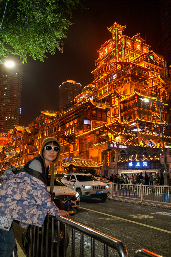 【洪崖洞】来重庆必打卡的地标之一。而每到节假日,洪崖洞更是当之无愧的流量大咖。洪崖洞原名红崖门,是古重庆城门之一,在原址的基础上,洪崖洞以最具巴渝传统建筑特色的吊脚楼为主体,依山就势,沿江而建,是别具一格的“立体式空中步行街”。短短几层楼,就汇聚了餐饮、娱乐、休闲、特色文化购物等六大行业,一时间华灯璀璨,风光无限,成为当之不愧的最具层次和质感的城市景区商业中心。夜晚的洪崖洞有着最让人熟知的一面,当它灯光刹那打开,就像沥上一层层金黄的颜料,恍若千与千寻的梦幻感,分分钟像穿越到二次元的空间中。这是在地面拍摄的场景。拍照出片指数:★★★★★