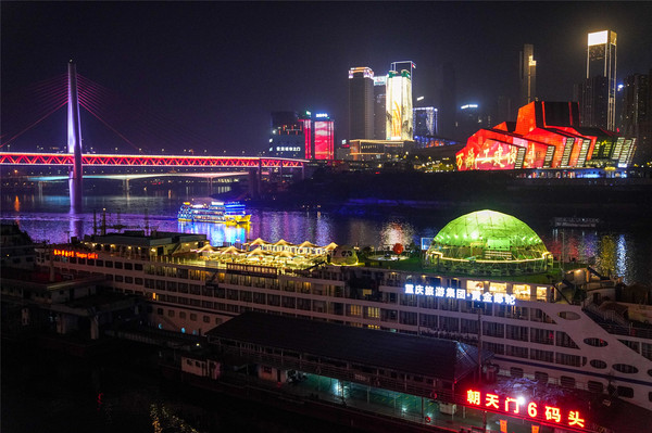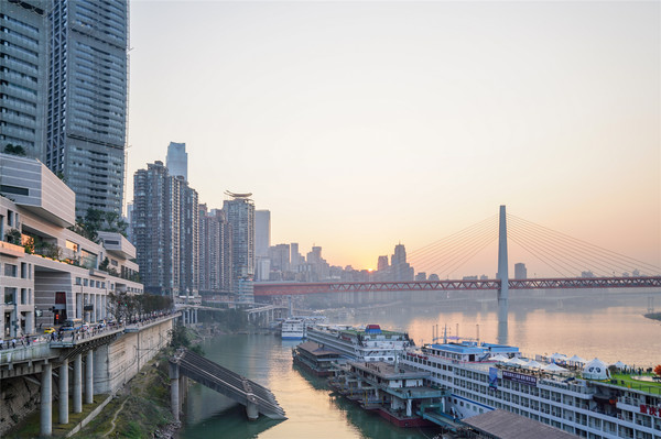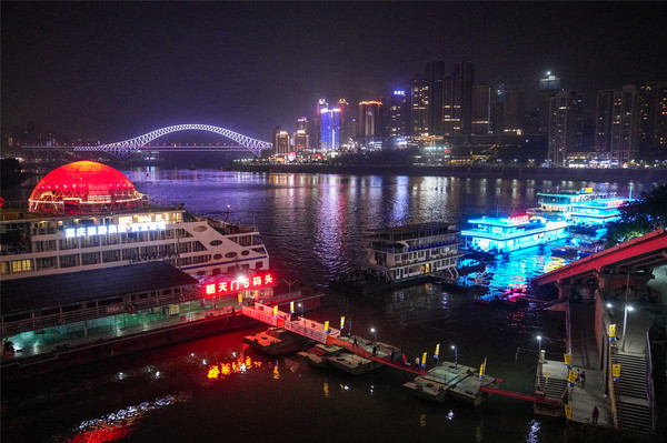 【朝天门】位于重庆渝中区渝中半岛的嘉陵江与长江交汇处,长江的九大主要支流之一的嘉陵江在此与长江汇流,一泻数千里注入东海。著名的长江三峡就在重庆至宜昌航段,所以,人们把重庆作为游览壮丽的长江三峡的最好起点。
