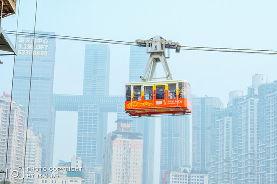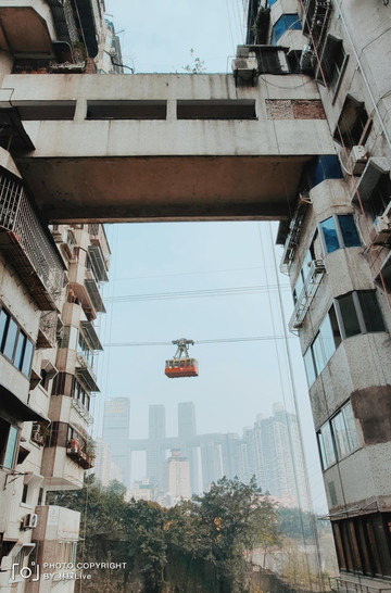 这就是白象居最火的一个机位了,在这个接近90度弯坡道上,拿起手机对着天空,静待长江索道上的缆车经过。