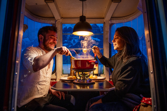 在Fondue Gondola餐厅温馨的滑雪缆车内,享受一顿浪漫的瑞士奶酪火锅。这里是冬季温馨而别致的约会场所,享受与家人一起度过的静谧时光。