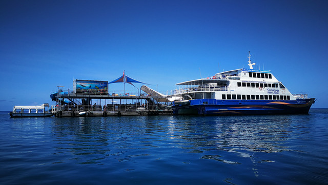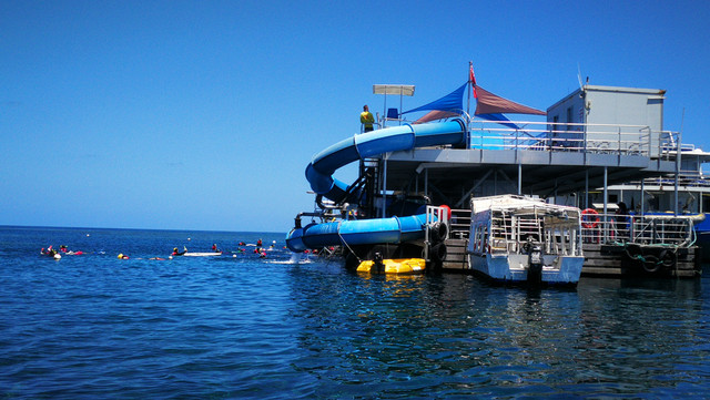 刚到平台,就有以为说中文的美女接待了我们,并详细讲解了平台上的各个项目和时间安排,有半潜船,玻璃底船,浮潜区,水滑梯,还有免费的自助午餐等。这里项目不少,具体说几个重点的事项: