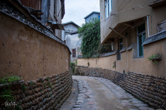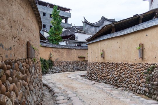 鹤形路是通过 龙口 古厝的 通道 ,入口的书斋是鹤嘴,鹤颈有150米长,中间的土层是鹤的食道,两侧的墙基是由一粒粒的鹅卵石砌成相当于鹤吃的米,这是一条根据五行八卦的要求而做的路。要看鹤形路的最佳观赏点应该是隔壁巷子的松口气客栈三楼阳台上,可惜的是我没有拍到最美的那个画面。