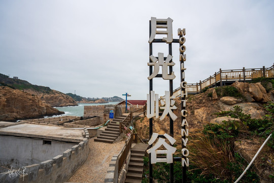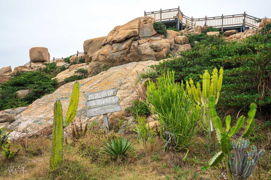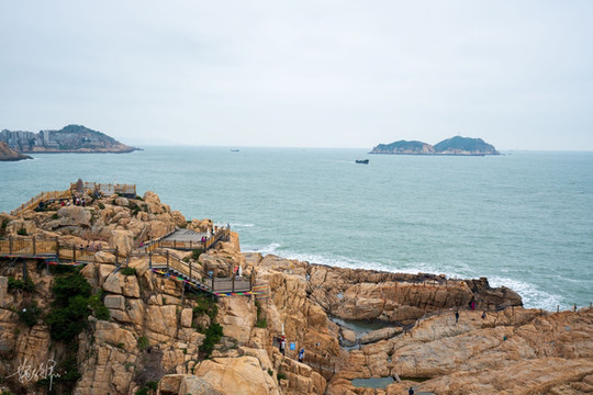 人们在礁石上爬上爬下,加上整个景区布置了很多网红打卡点,海边礁石上白色的框框,景区出口处红石滩上的木栈道很多人合影的白色月亮,沿途的彩色的路标、悬挂锁芯和文艺范儿的文字,让人忍不住想多合影留念。