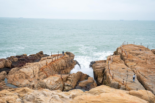平流尾地质公园就是在一大块巨大的火山岩石上建成的一个景区,行走在景区规划好的木栈道上,沿路可以看到各式各样的海蚀地质地貌。