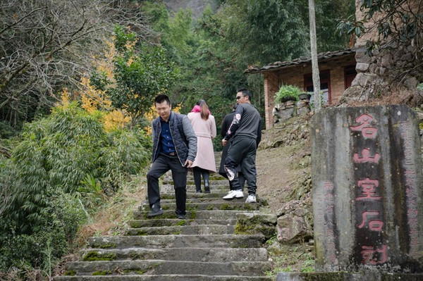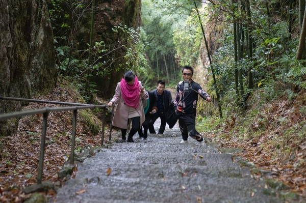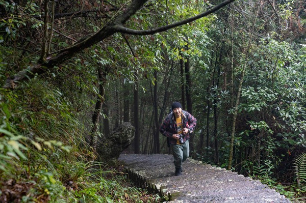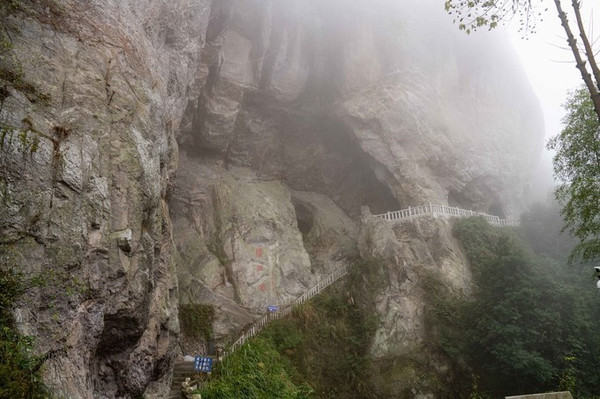 这条路下雨天不建议爬,比较湿滑难走,晴天也不建议带老人和小孩,因为比较陡峭。所幸一旁有铁栏杆,便于扶着行走,我们是登梯上,下山是沿着新修的马路蜿蜒而下,马路宽广驾驶车辆可行,只是到达名山室山下的一段路在维修,故而将车停在维修处。