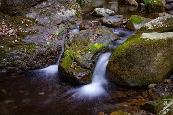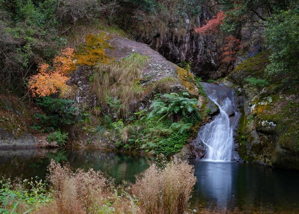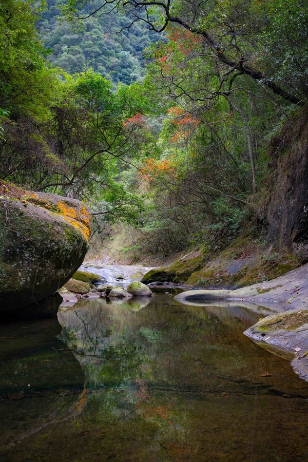 流水、瀑布、深潭,青龙瀑布景区的精髓所在,即便枯水季节亦不失其风姿。加上山中偶尔一枝红叶、黄叶,映在碧绿的水中,让倒影都如此迷人,如此有诗意。