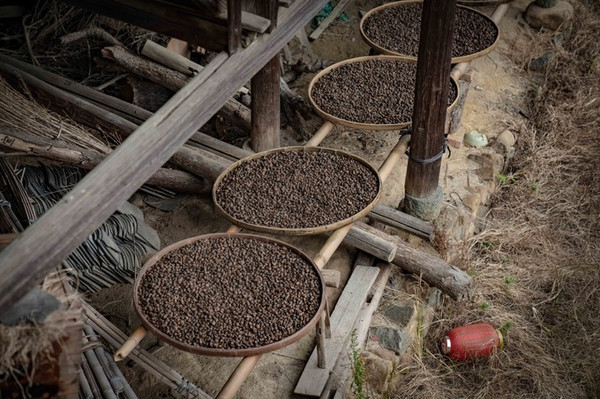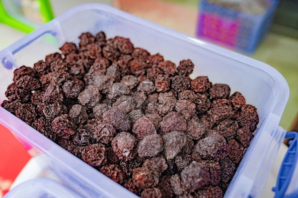 嵩口古镇特产芙蓉李,这种果子成熟后,青粉相间,神似芙蓉,故而得名。芙蓉李的果子被当地人经过摇青、洗果、摊晒、腌渍、焙李这几道程序后就成了李干。