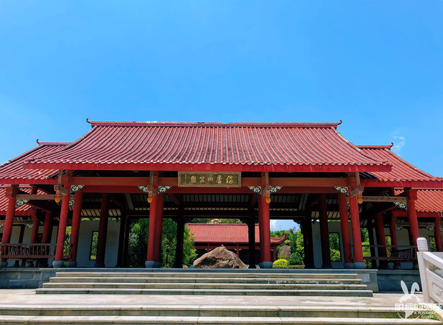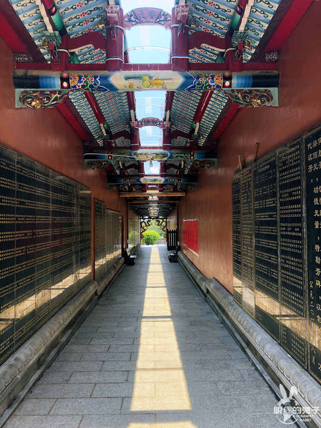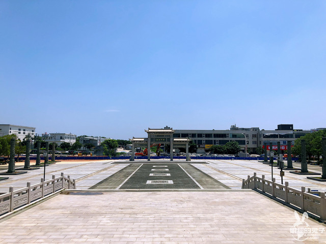 在公园门前,是一个广场,一座崭新而古朴的巍峨石坊耸立在广场中央,石坊里面两侧并列立着8根镂空石龙柱,再里面是数十层与石坊一样宽的踏步连接在仿古廊式红柱朱顶的进山门前。