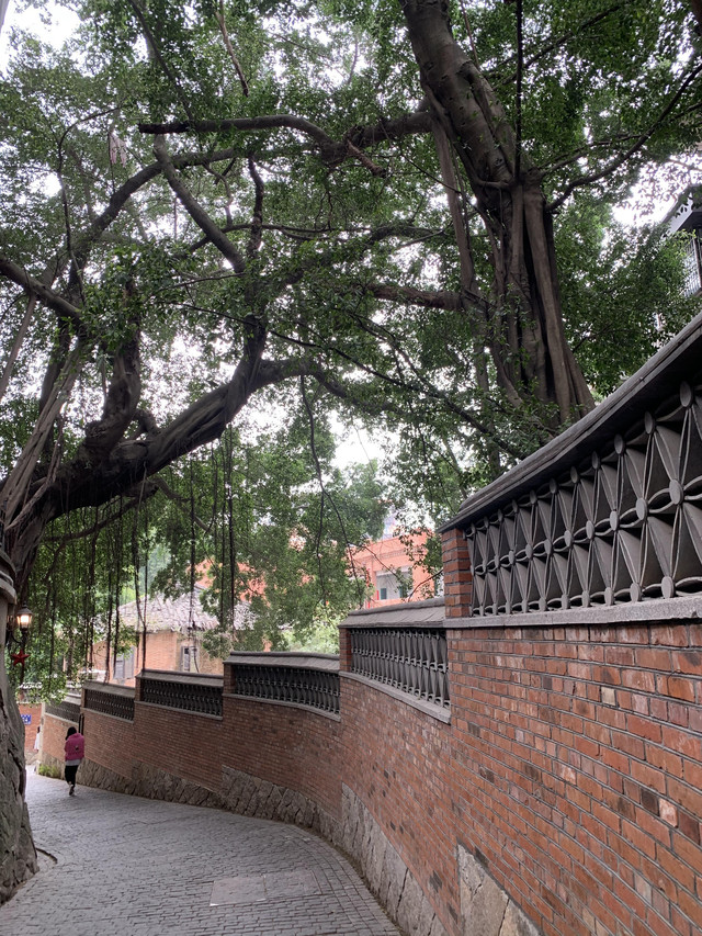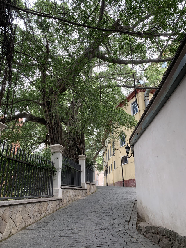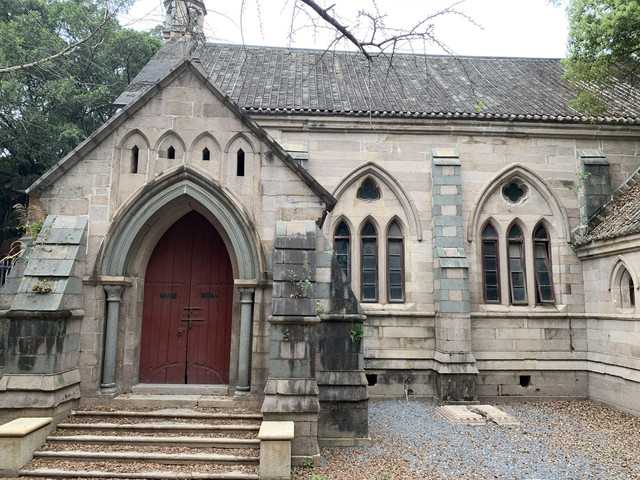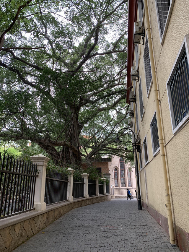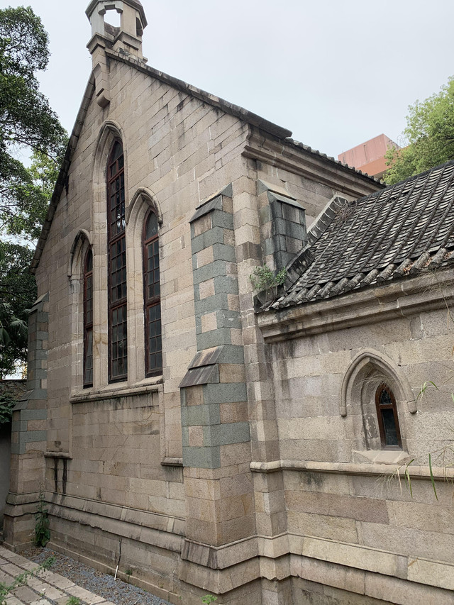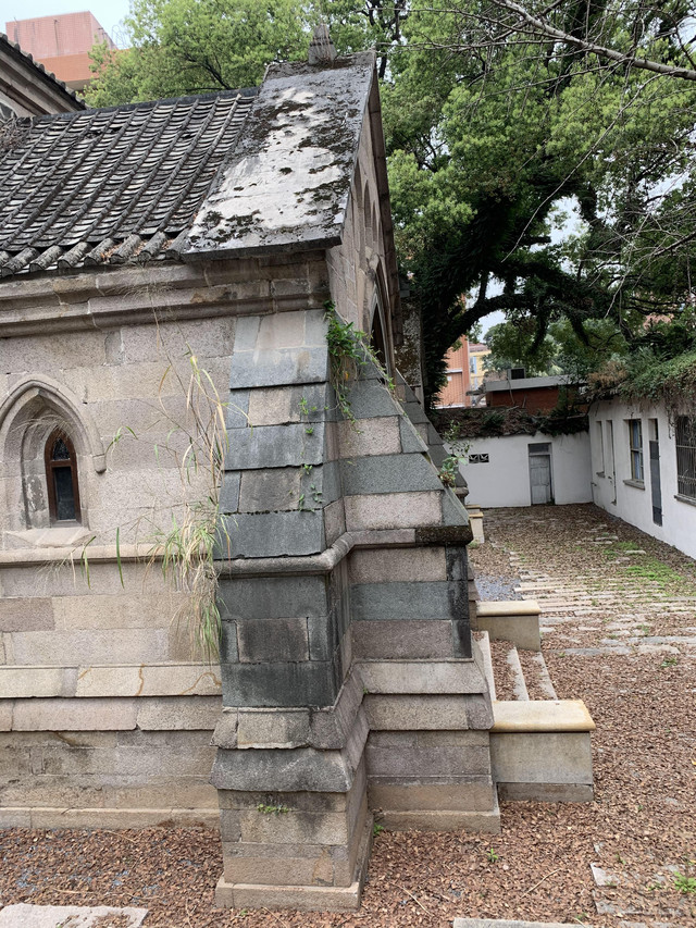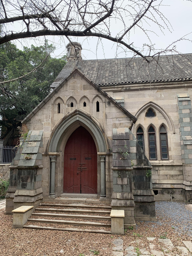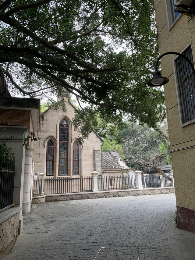 从闽江河畔坐车去石厝教堂,沿着烟台山石头铺就的道路顺着山势往上,两边全部是西式建筑,民国风味十足,树木遮天蔽日,深邃幽静,几乎没有行人,仿佛回到了过去的年代。
