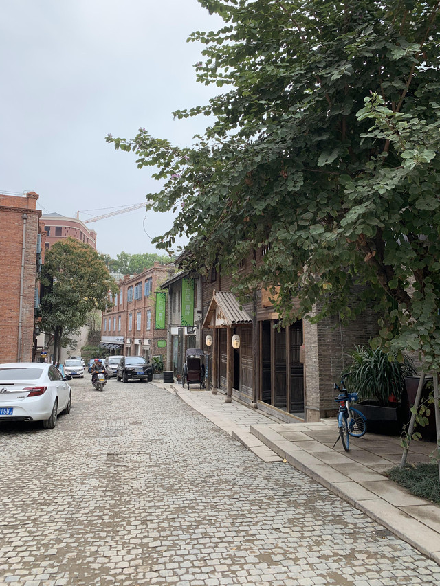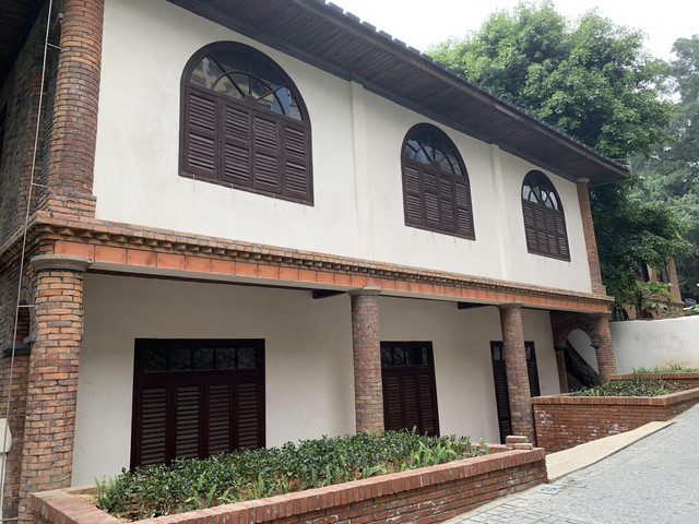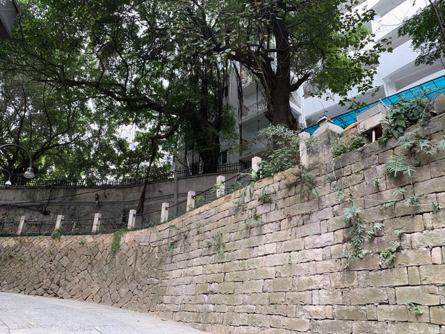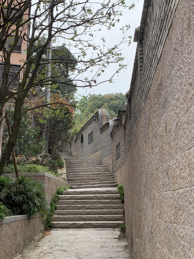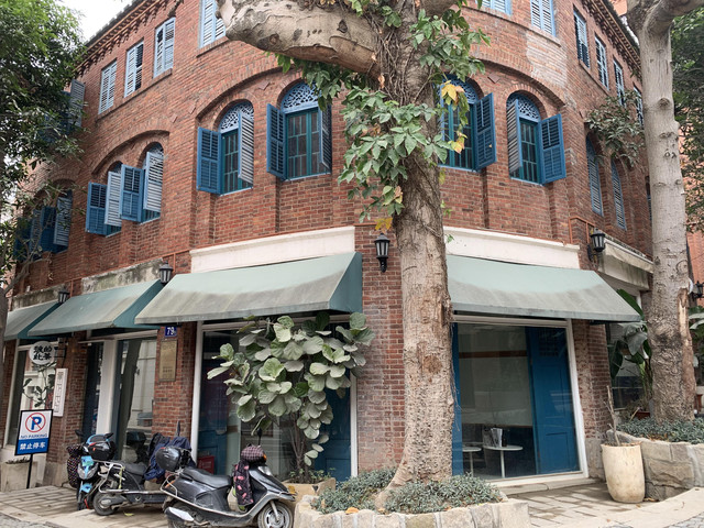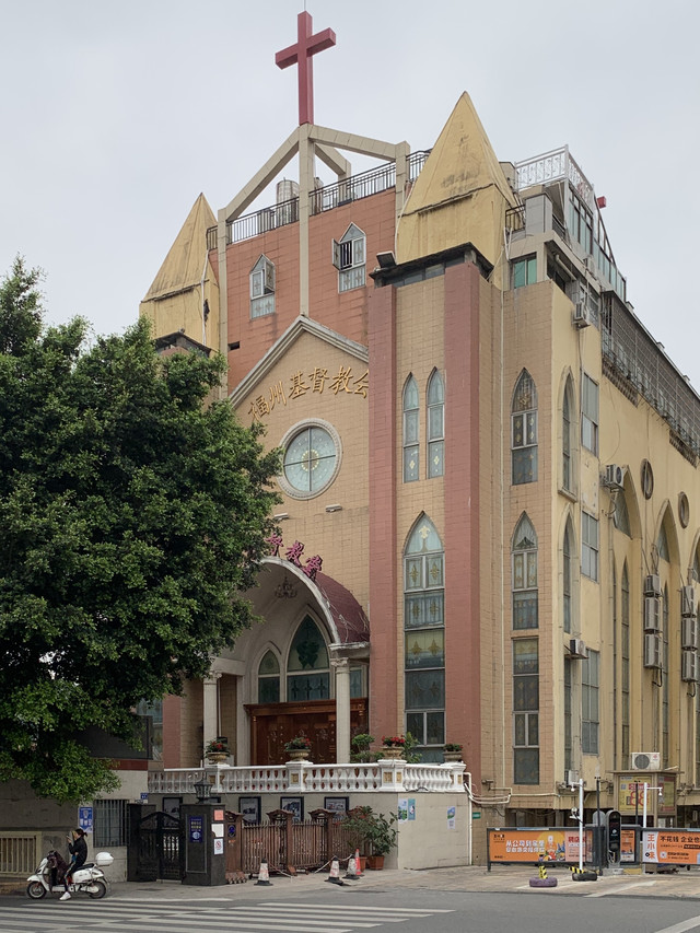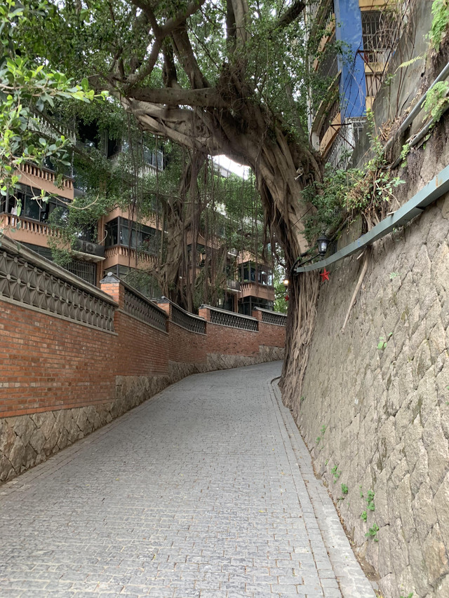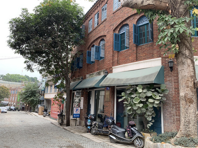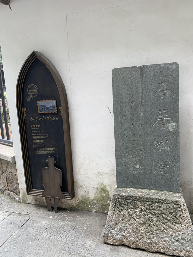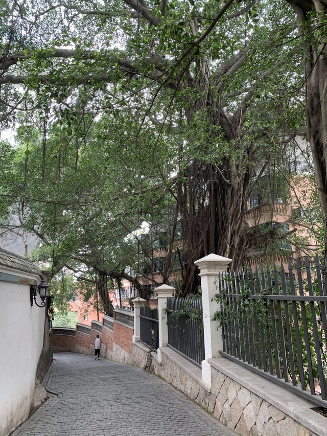 从闽江河畔坐车去石厝教堂,沿着烟台山石头铺就的道路顺着山势往上,两边全部是西式建筑,民国风味十足,树木遮天蔽日,深邃幽静,几乎没有行人,仿佛回到了过去的年代。