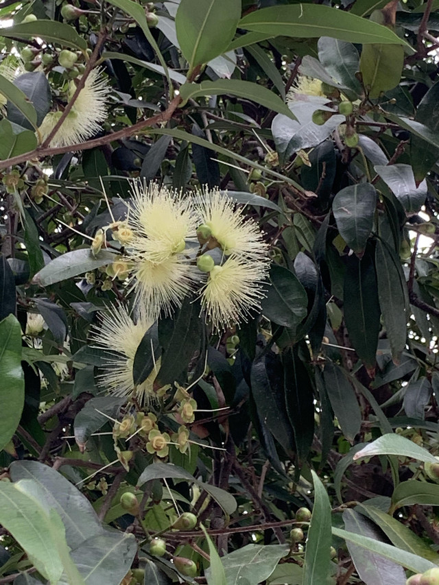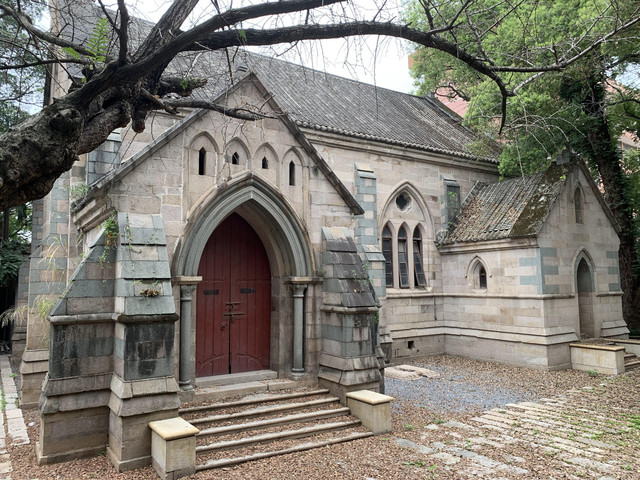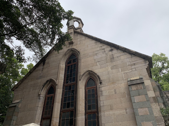 教堂没有开放,整个建筑近似工字造型,全部用蓝灰两色的花岗岩砌成,色彩明快且有层次感,哥特式尖券门窗,简洁有力,窗棂上面的镂空玻璃不对称,分别是三瓣花朵和四瓣花朵,动感变幻又玲珑细腻,可以想象如果太阳照在上面,室内的彩色光影有多美。侧山墙上有一个小型八角形钟塔,在岁月的沧桑里不露痕迹,教堂两侧各有一棵古树,右边是樟树,左边是百年银杏,去年秋天干枯的落叶仍然铺满院子,仿佛厚厚的地毯,似乎可以看到秋天铺天盖地的金黄树叶。