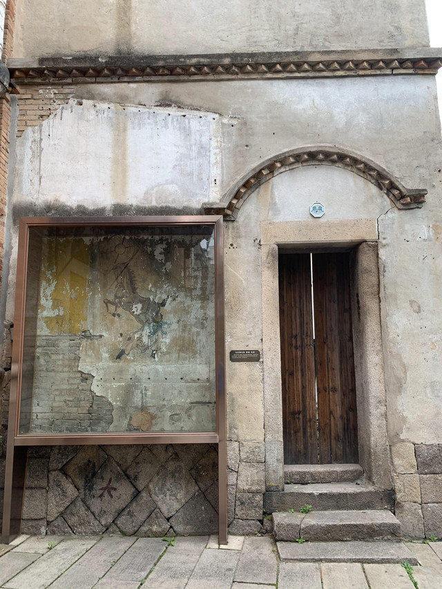 河边民居的墙上有一幅民国时期的马倌训马图,沧桑斑驳却不乏生动,腾起的马匹和紧拉绳索的马倌栩栩如生,观赏壁画仿佛身临其境,壁画已经被玻璃罩保护起来了,但一点没有影响观感。
