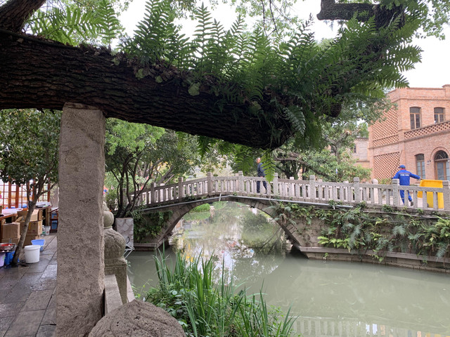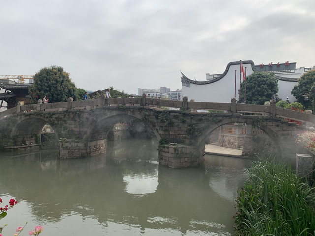 河中、桥下正在人工喷雾,云烟氤氲,雾气缭绕,宛如仙境。