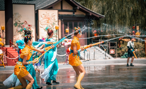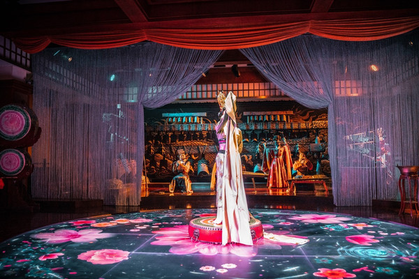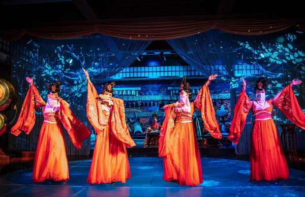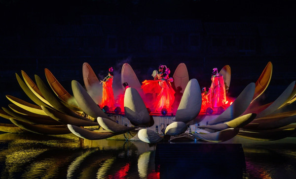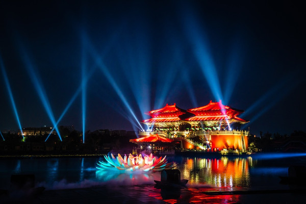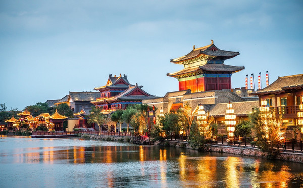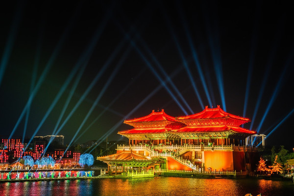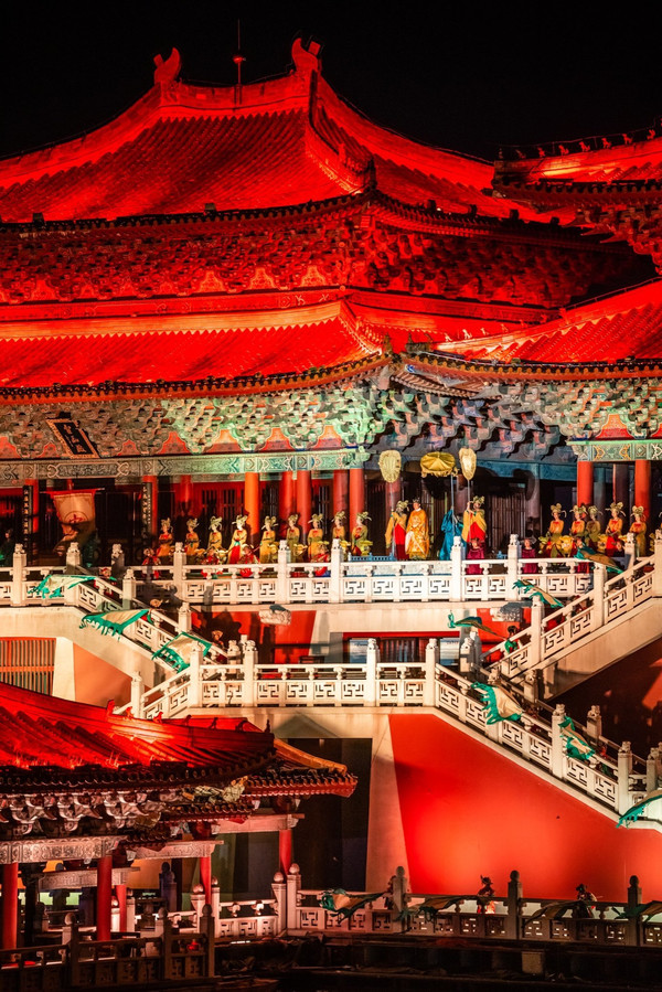 若是购买了《东京梦华》的表演票(夜晚会清场用作表演场地,持票者可入内),进到景龙湖畔,还能看到巍峨大气的临水大殿和茗春坊。
