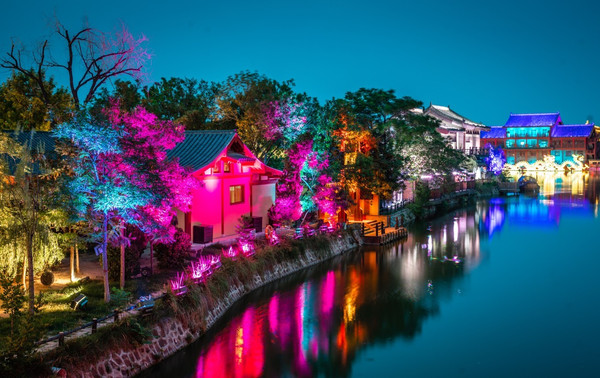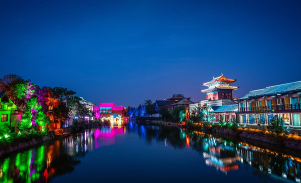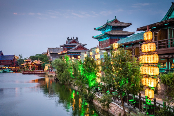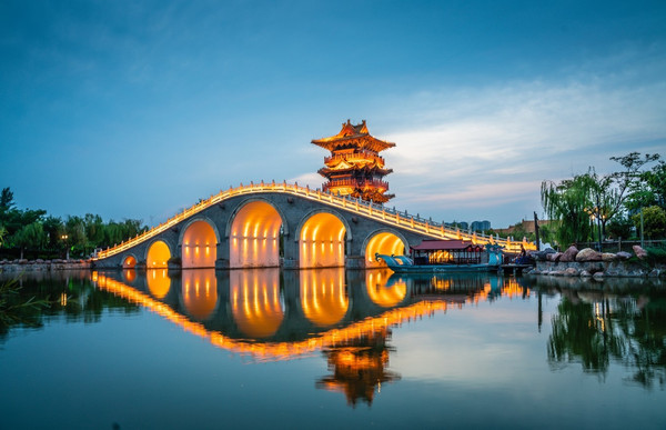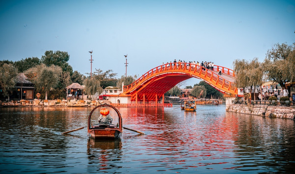 经过九龙桥后,继续沿着湖边而行,便来到了双亭桥和听雨桥,在这里可以乘坐游船夜游汴河,这桥的形状是根据北宋王希孟创作的《千里江山图》改变而来。