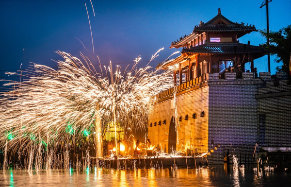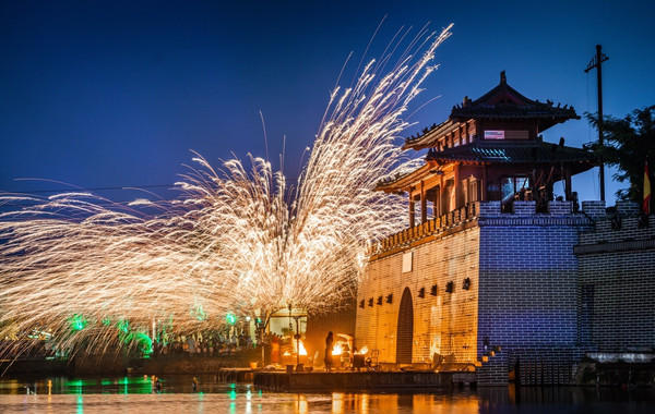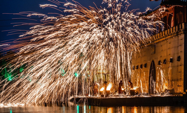 出上善门后继续往前,一路去往西水门,每晚的打铁花也不要错过了,夏季的时间是20:40开始,这是起源于北宋,地地道道的河南民俗文化,表演开始时,铁汁溅起了十几米高的金色火花,像焰火一样照亮了天空,在宋代时,人们用打铁花的活动给新的一年讨个好彩头。