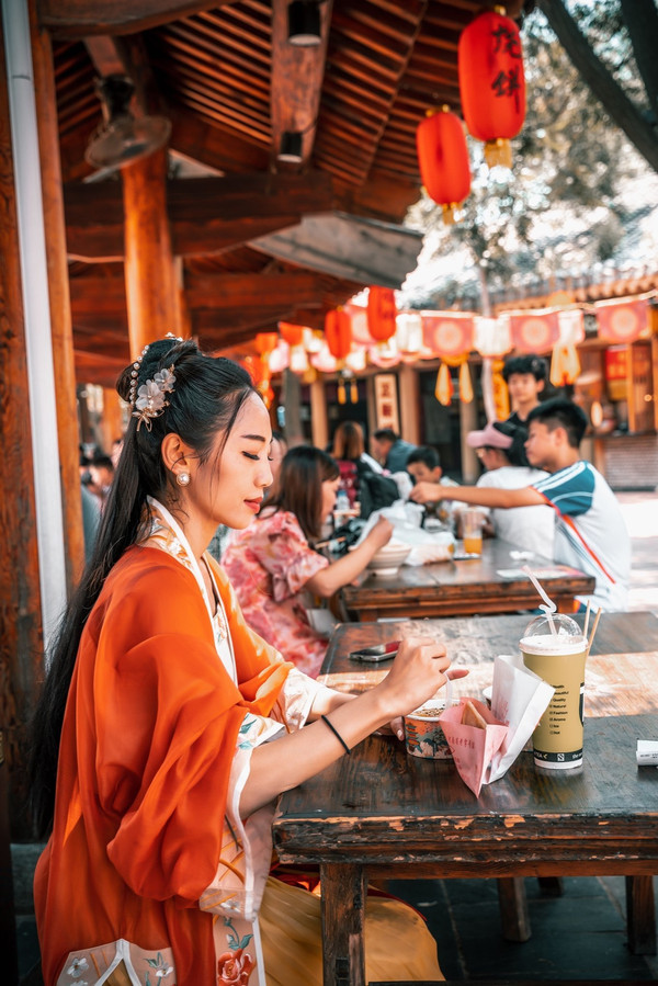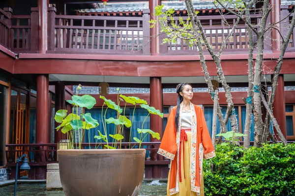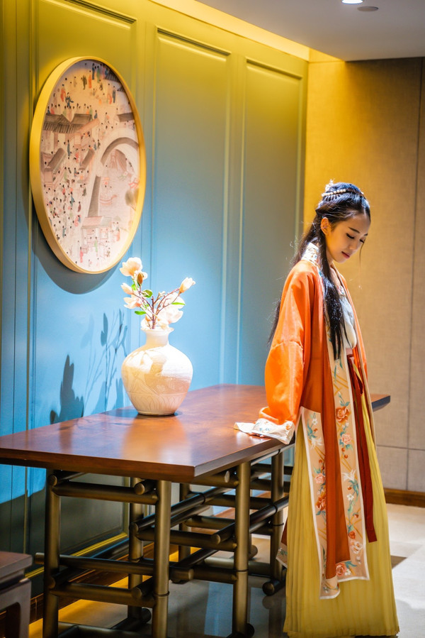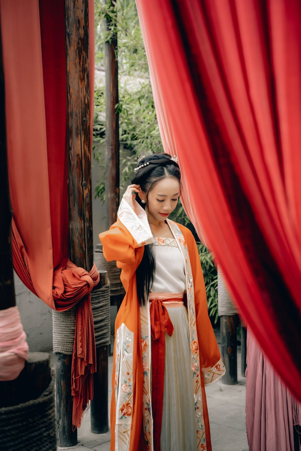 为了承托出清明上河园的喜庆,我们的女主角挑选了一套橙色的褙子装,这在宋代时是大家闺秀的钟爱款,也最具代表性,瘦身窄袖,长到脚踝,特别显瘦,有诗曰:“窄罗衫子薄罗裙,小腰身。”