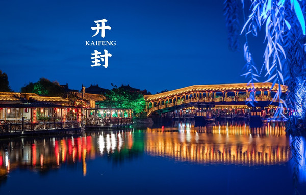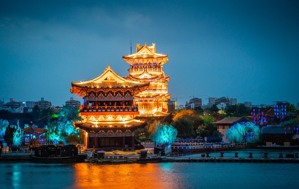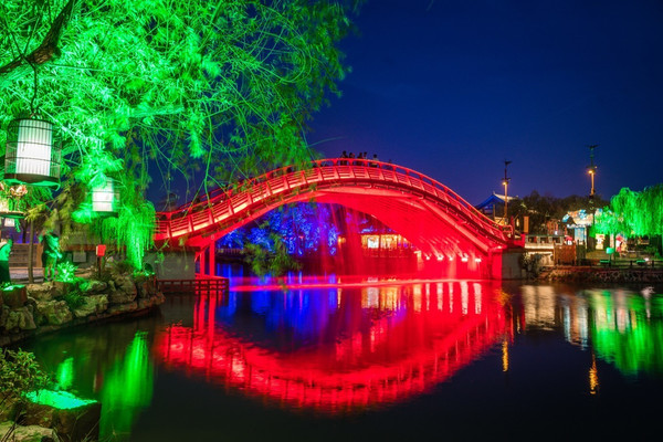 站在鸳鸯桥上,是观看汴河两岸夜景的绝佳之地,南侧的通津门高大雄伟,会根据灯光不时变幻颜色