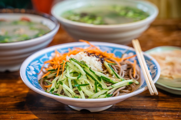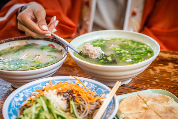 丸子汤比较适合肉食动物了,是把焖牛脯、黄花菜、煨面筋和烧丸子这四种菜肴合起来放在一起,冲上一碗用羊肉、羊骨头熬制的滚烫鲜美的羊肉汤,食时依据各人喜好加香菜和油辣子,色香味儿俱全,黄白绿红四种色相互映衬,荤素搭配、菜汤互衬,极其营养。