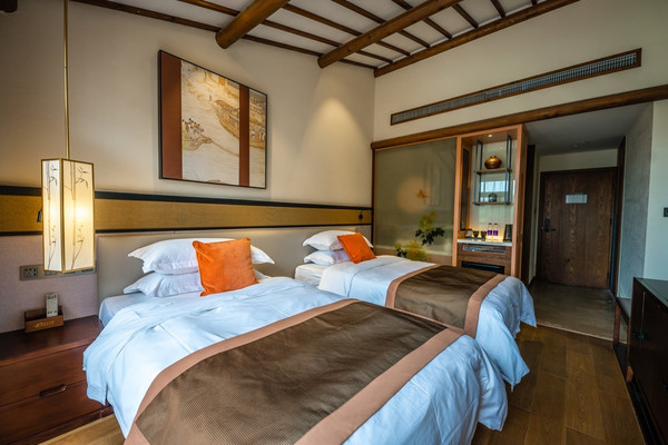 我在满庭芳住过的户型有两种,一个是如上图所示的宁静双床房,一个是如下图所示的雅致豪华套房,都是舒适淡雅的居住风格,宁静双床房稍显紧凑,雅致豪华套房则宽敞许多,提供了更多的活动空间,房间内有很多绝妙的小设计,用一些插花和灯饰勾勒出一个更雅致的居所,可见设计师的国学功底。
