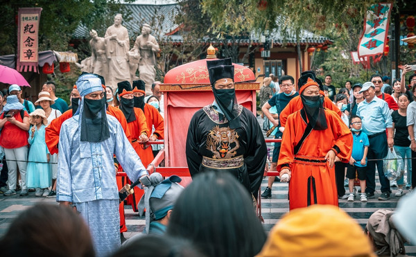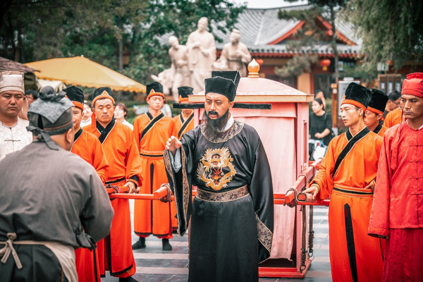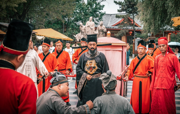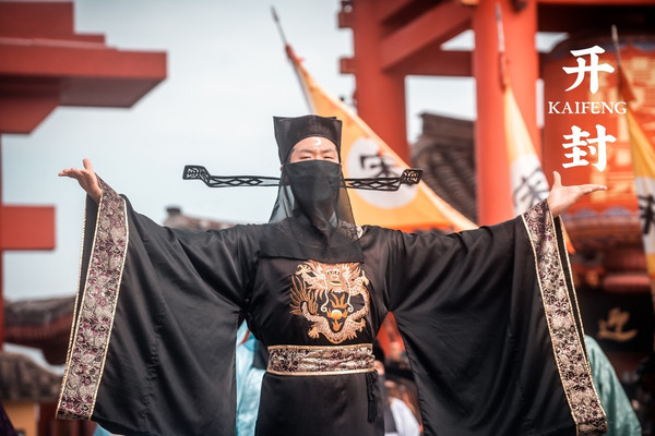 在清明上河园中,我们可以在好几个场合下看到他,比如一大早开园的【包公迎宾】,作为整个景区的形象代言人打开大门迎接来自全国各地的穿越者们,紧接着他又会出现在汴河之上【巡视漕运】;然后回开封府休息一段时间,直到下午,再到虹桥广场秀秀存在感,搞一次【包公巡案】,智破杀牛案;晚上还会出现在【东京梦华】的表演中,当一次氛围组,打一次酱油,烘托全场气氛。
