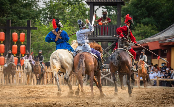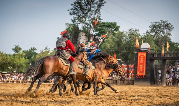 一场精彩异常的马战开始上演,有时候一对一,有时候二对二,最多的时候是五人团战,五匹马保持着高速奔跑和极速转弯,马上的人却像在平地一样,双手用兵器交战,格外精彩,让人屏息,好担心一个失误就从马上掉下来。