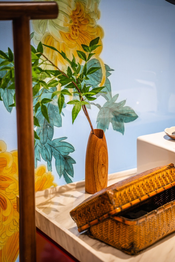 装饰玻璃上的菊花元素,装裱的《清明上河图》一隅,都带着极强的地理暗示,这里就是大宋朝的首都--汴京。