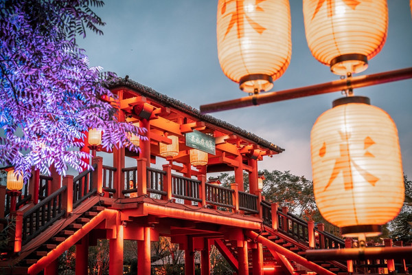 南面就是鸳鸯戏水桥,在宋代文学家孟元老的《东京梦华录·河道》中有这么一段话,“自东水门外七里至西水门外,河上有桥三十。”可见桥就是汴河上最亮眼的一道风景,而在清明上河园中也同样如此,鸳鸯桥链接着汴河南岸的满庭芳酒店和主园区,本身也是一座造型奇异的灯笼廊桥。