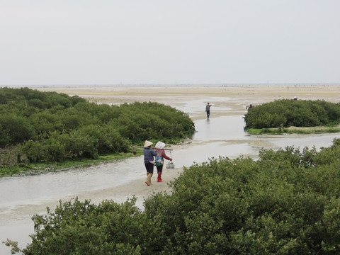 红树林是热带、亚热带海岸与潮水间地带特有的木本植物。素有海上森林之称,是鸟类的天堂,其中数量最多的是白鹭鸟,群群白鹭在林间觅食玩耍,时有百鸟飞翔的景象蔚为壮观,可惜没赶上观鸟季,看着远处孤零的水鸟尽量发挥想象吧。每天早晨当地的渔民男男女女都走出家门拿着工具赶海,哪儿的沙滩上留下无数的贝类、螃蟹、沙虫、泥丁。