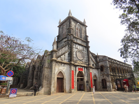 盛塘天主教堂是典型法国文艺复兴时期的哥特式建筑,晚清四大天主教堂之一。古老的教堂采用的建筑材料全取自岛上的珊瑚、岩石和石灰,显得很特别。教堂大门外的广场上有两颗枝繁叶茂的大榕树,树龄有好几百年了。教堂周围的小巷还保留着涠洲岛最原生态的建筑及生活方式,慢慢的行走可感受老涠洲岛的慢生活。