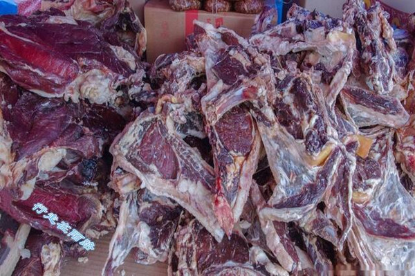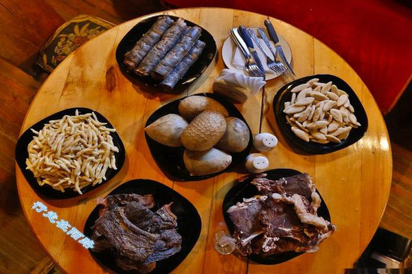 另一家选的是南奥餐厅,特色是猪腊肉、熏牛肉和风干羊肉,主食只有粗面馍馍、炸的细面段和烘烤的粗面皮,兰卡尔、司机和我各选各的,于是就出现了三种肉和三种主食的罕见场面,就连餐厅老板都不太相信的连问两句:真的要这么多吗?