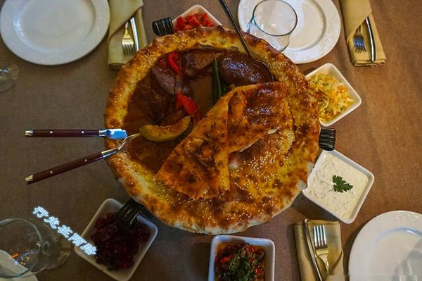 看到我们点这道菜时还在交谈,服务员马上热情的解说:羊肉大烤饼的制作过程很繁琐,羊肉焯水去血沫加入大量草药与香料慢炖,直到汤汁浓稠后再和辣椒与胡萝卜等配菜一起放入面饼中,双面碳烤至少50分钟才能上桌,由于制作时间太久,餐厅每天只会预制两份,具体口味有酸辣和奶酪等等。