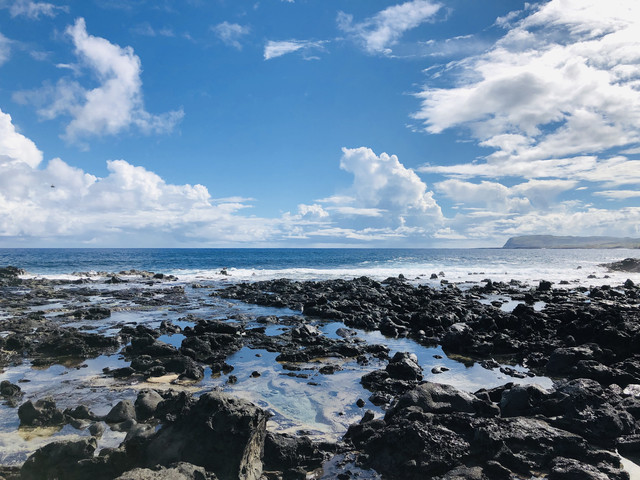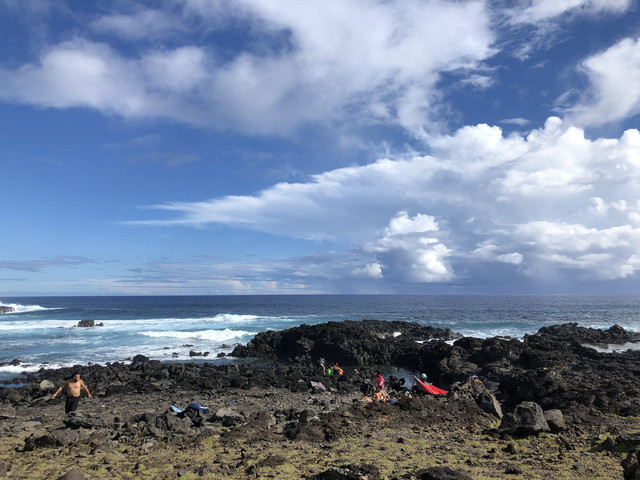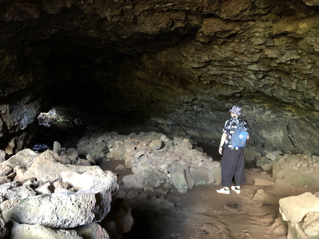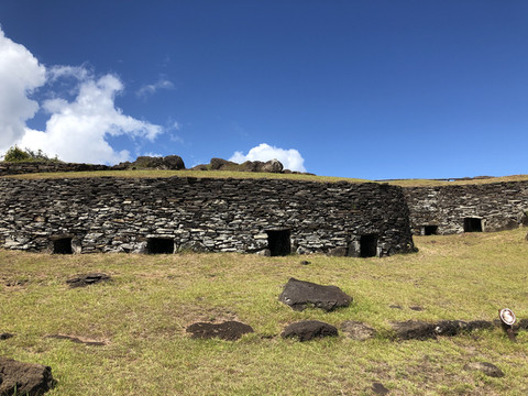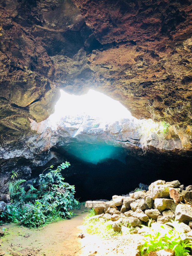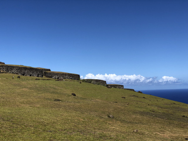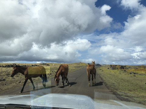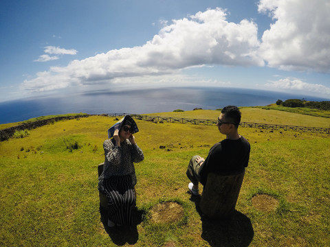 这是一个在天然形成的基础上,经过人工开凿后的洞穴,是原住民的早期居所之一。这个洞穴离Ahu Akivi不远,开车行至入口处后,需验票徒步前往,中间会传过一片开阔地。快到洞口的时候,看到一对加拿大老夫妻,穿着一身马术套装,骑着高头大马来到了洞口,和他们简单打了招呼后他们便先下去了,反而是他们的导游留在洞口和我们聊了起来,他听说我们是中国来的后很兴奋,拿出手机后告诉我们这是小米的手机,已经用了3年了很好用,然后问我们用的是什么手机,当我拿出苹果手机后,他连连摇头并说到:中国人怎么能不用中国手机,回去换小米吧。哈哈,不过到现在我的手机也还没有换过。