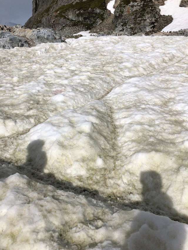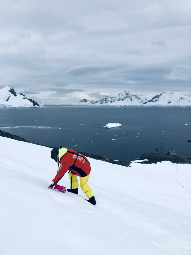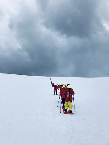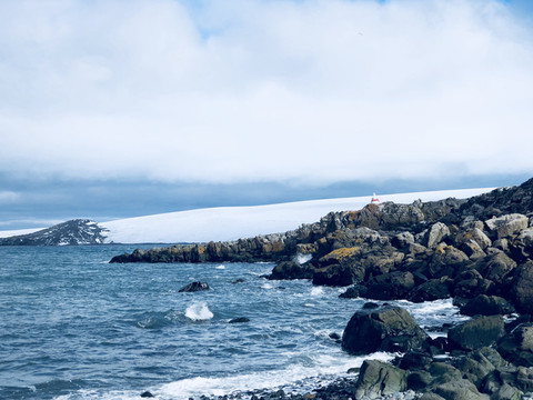 达莫角(英语:Damoy Point)是南极洲的海岬,位于帕默群岛的温克岛西部,处于弗拉格角西北面1公里,由让-巴蒂斯特·夏古率领的法国探险队发现。今天,我们在达莫角进行远距离徒步活动,徒步距离5公里,时长大约需要2个小时,毕竟船上的大多数都是普通人,在南极这样冰天雪地及未知路况条件下,这样的配速也算合理了,是一次不错的经历。大家登陆领取了踏雪板和手杖后,便一字排开跟着探险队员向深处进发了。今天的天气并不算太好,天空阴沉、劲风阵阵来袭,脚上绑着踏雪板,在松软的雪地上缓步而行,一步所消耗的力气比得上平时的三、五步,颇有一种在高原徒步的感觉,很是锻炼心肺。不过这一点点困难并不能阻止大家前进的步伐,一次真正的南极徒步所带来的兴奋感,让每个人的身上都有了足够的气力,因为在此往前的每一步,都有可能是我们这一生所到达的最南方。当然,这里没有金银宝藏,也没有南方姑娘,目之所及只有白茫茫的一片,有时甚至分不清天与地,多走一步与少走一步的所见所闻似乎也都是一样的,但正是这些看似相同的步伐将我们带来了这里,这个令我们终生无悔的地方。