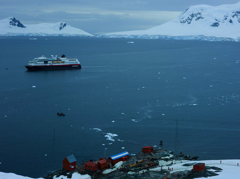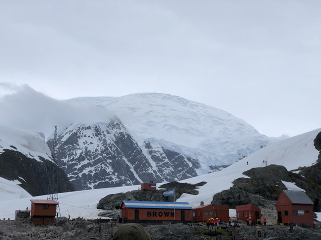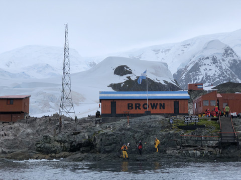 我们今天下午的登陆地点,便是位于天堂湾的布朗站。布朗站,位于南极半岛西海岸,天堂湾东侧,属于阿根廷,其命名是为了纪念爱尔兰裔阿根廷海军奠基人威廉姆·布朗。布朗站曾经在 1984 年被精神分裂的驻站医生烧毁,后又重建,目前只有夏季短期有人员驻留。登上布朗站的小山丘可以欣赏天堂湾美景,沿途还会遇到大量的野生动物。