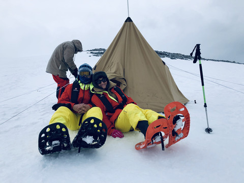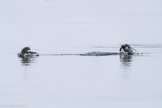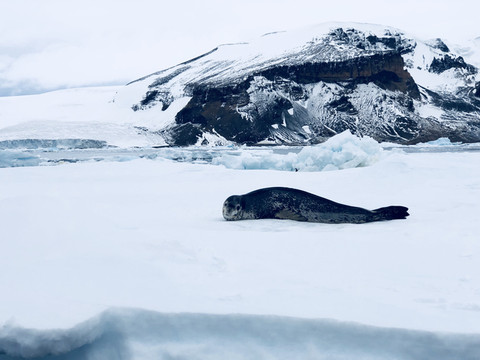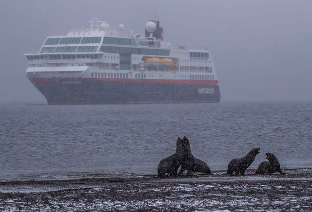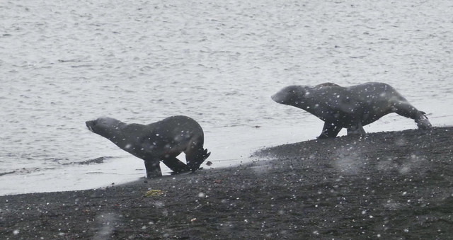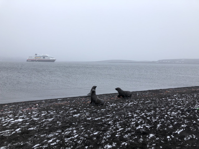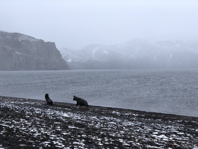 岛上除了大量遗迹以外,还有大量的南极海狗,它们在岸边嬉笑打闹,丝毫不在意我们的到来,另外,岛上还有一对留守的来自挪威极地研究所的科研人员,他们住在岛上的帐篷里,每半年或一年进行一次轮换,在我们登岛的同时,他们也登船改善一下伙食、进行了一次难得的沐浴更衣并给我们带来在捕鲸者湾野外工作的介绍,很难想象他们是如何在如此恶劣、单调的环境下进行科研和生活的,对于他们,我们只有崇敬。我们在这里还进行了冬泳活动,真的很佩服下水的猛士们,可惜本人不会游泳,又担心万一感冒发烧影响接下来的行程,如果是晴好天气也许咬咬牙也就下水走一圈了,但那天却是天空阴霾,寒风夹杂着雪粒打在身上啪啪作响,蠢蠢欲动的内心只能作罢。