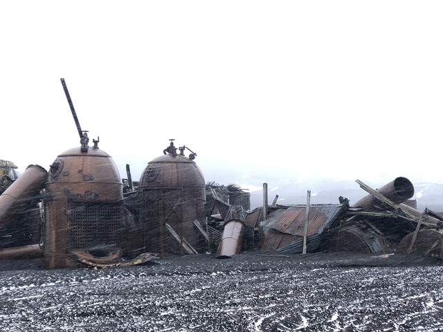 迪塞普申岛又叫欺骗岛是一片位于南极洲东北的南设得兰群岛上,由黑色火山岩形成的小岛,它是南极洲的活火山之一。在远古冰川纪时期,南极海底火山喷发,火山口塌陷,形成了这个天然港湾。这个环形的火山岛只有一个非常狭窄且常年大风的入口,入口处约 200 米。因此,船只只有大约 100 米宽的有效通行空间,需要十分精准的定位。一旦安全通过入口,船的右舷方向就是我们计划登陆的捕鲸者湾了。这里在 19 世纪初曾经是捕鲸船的加工厂,因此,海滩上留有捕鲸加工的遗迹和鲸的骸骨。同时,海滩上还有一个因为 1967 年火山喷发而被废弃的科考站,也是历史遗迹之一。其“欺骗”名称的由来就是因为这是个环形火山岛,从外部看,岛屿是一体的,直到人们找到一个缺口,才发现它其实是一个被淹没的破火山口。所以说,欺骗岛从来没有撒谎,欺骗我们的是我们自己的眼睛。