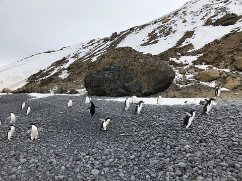 午饭过后,便到达了埃雷拉海峡,停船放艇准备登陆。在穿过了冰山与浮冰的重重阻隔后,我们的小艇终于开拓出了一条登岛路线。在憧憬着与岛上企鹅近距离接触的想象时,一股臭鱼烂虾的腐败味儿一下子把我们拉回了现实,也难怪,企鹅大部以磷虾为食,那企鹅的便便也基本就是臭虾了,登岛后看到的那些粉色印记便是它们随地大小便的证据。登岛过程很顺利,岛上的小企鹅们憨态可掬,甚是惹人喜爱,让人有抱起来撸一把的冲动,不过根据IAATO南极旅行规范,前往南极旅行的人员必须与企鹅保持5米以上的距离,不得主动追逐企鹅,但是如果你待在一个地方保持不动,并且是企鹅主动接近你的话,距离不受限制,哈哈~所以很多小伙伴就选择做在海滩等待这企鹅的靠近,我家那位也不例外,我则选择顶着刺鼻的气味向深处走一走、看一看,哈哈哈~