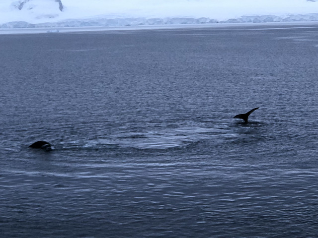 在完成徒步返回船上后,船周围突然出现了大量的座头鲸,他们成双出现,呈螺旋状不停的浮向水面然后潜入水中,仿佛在进行一种仪式。后来经探险队员讲解,这是它们捕食鱼虾的一种方式。