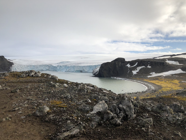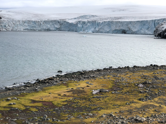 下午因为还有足够的时间,船长临时决定增加一次登陆活动,便组织登陆了长城站附近的另一个地方-尼尔森岛,并在岛上进行了一次短距离的徒步。岛上大部都披着厚厚的冰盖,我们正好选择了一片没有冰的石滩登陆。这个岛上居然还有几个人在常住,就住在木板搭成的简陋房子里,探险队员特意叮嘱我们不要去打搅人家,所以他们为何居住在这里我们也就无从知晓了。在岛上我的手机还连上了韩国的移动网络,估计附近有一个韩国科考站,后来回来查了查,果然如此,“世宗王站”,又称世宗基地,是目前韩国在南极第一座科学考察站,它位于南极乔治王岛菲尔德斯湾入口东侧的岬角上,与中国南极科考站长城站隔海相望。