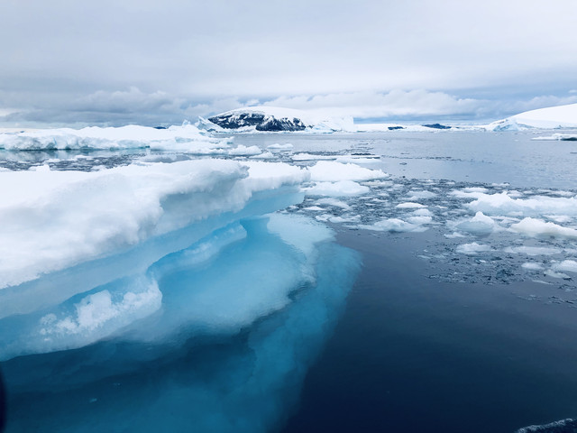 因为昨天未能登陆长城站,船长通过广播向我们说:今天会带领我们传过南极海峡,去往一个一般轮船从未到达过的地方----威德尔海。这一下又把我们的积极性提高了起来,可好景不长,刚刚驶出南极海峡不过1小时,前面便被成片的浮冰挡住了去路,如果硬闯估计下个世纪就有一部电影叫《午夜阳光》了,看来威德尔海也是去不了了,无奈只能返航。这一下,心情是落到了冰点,不会这趟南极之行最后只能是坐船吧。当轮船返回南极海峡后,风浪突然变的平静了,虽然天上还是成片的乌云,但是目视已经达到了可以登陆的条件,果然,在到达布朗断崖后,船长下达了可以登陆巡游的许可,第一次踏足南极大陆的时刻就到来了,哈哈。